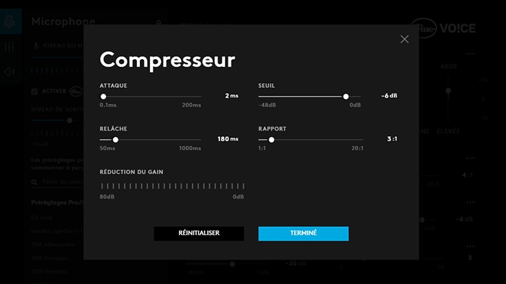 Le volume de votre signal vocal est plus constant, ce qui vous permet d'être plus facilement entendu, que vous soyez en train de crier ou de chuchoter. Réduit la plage dynamique d'un signal audio en atténuant la sortie par rapport aux commandes de seuil et de rapport.