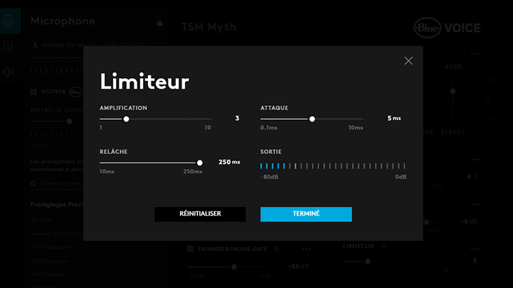 Un limiteur compresse la sortie du signal audio selon un rapport infini, limitant ainsi le signal pour qu'il ne soit jamais plus fort que le niveau désiré.