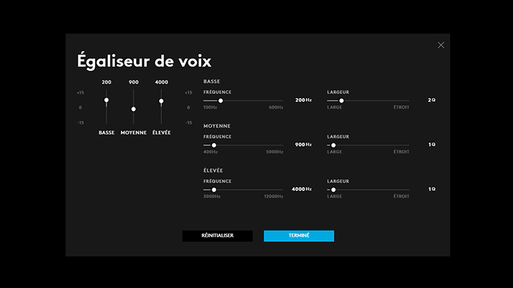 Les fréquences sélectionnées peuvent être réduites ou augmentées pour modifier le profil sonore du signal. Blue VO!CE inclut un égaliseur variable à trois bandes, permettant à trois fréquences individuelles d'être ajustées selon leur sortie, leur fréquence cible et leur facteur Q. Le facteur Q définit la quantité de fréquences adjacentes qui sont affectées par la fréquence cible. L'égaliseur est idéal pour accentuer les éléments de la voix qui sonnent naturellement bien et pour réduire les éléments désagréables.